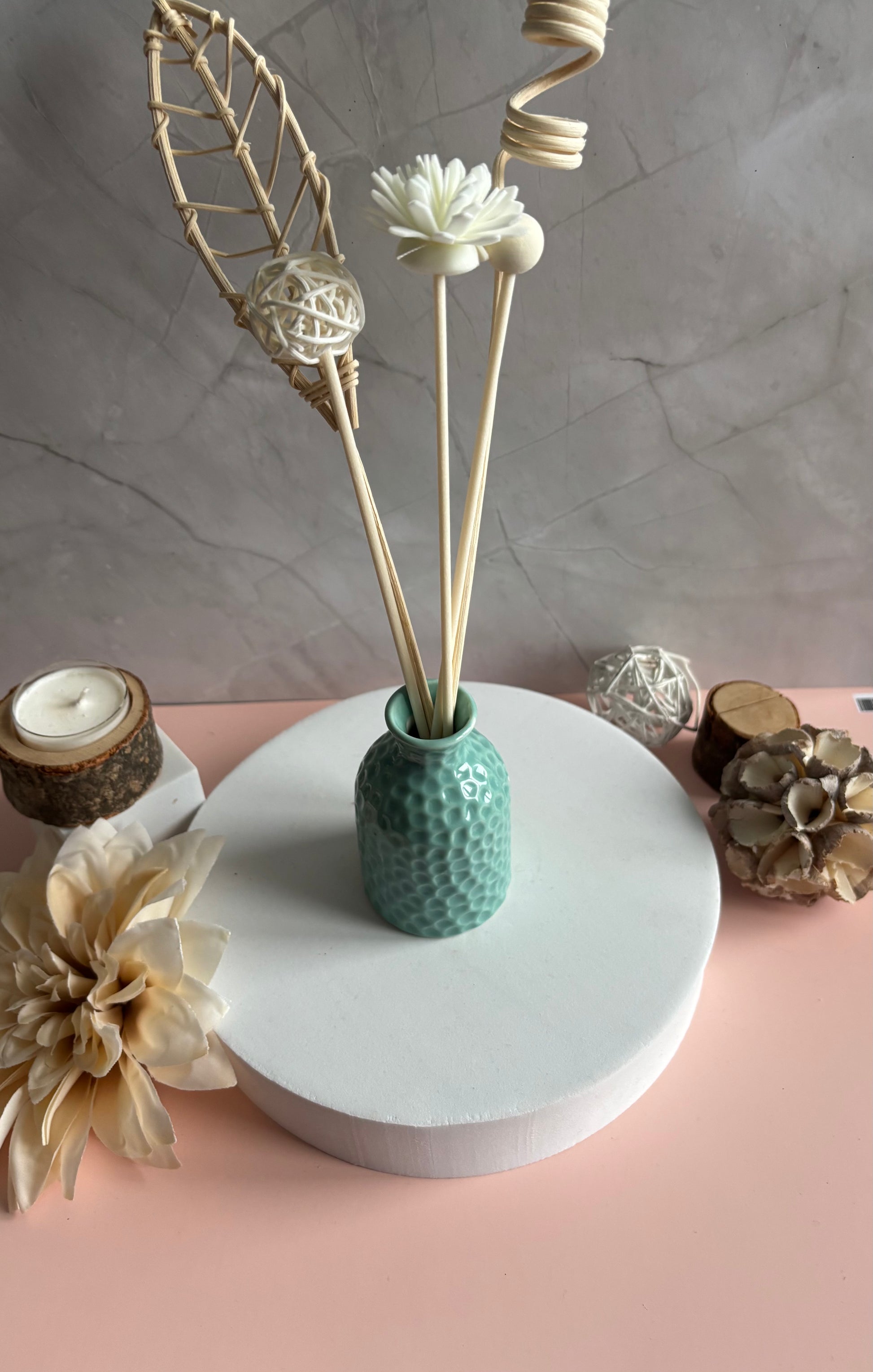 Son flacon en céramique aux formes délicates accueille des tiges en rotin qui diffusent subtilement le parfum Lin et Coton. Les éléments tressés ajoutent une touche artisanale et apaisante, idéale pour créer une ambiance chaleureuse et raffinée.